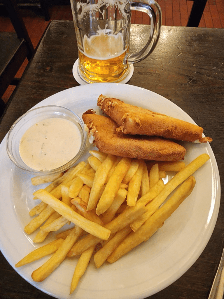 (This is a german fried cheese plate. Simple, no garnish, fries and beer – and it works.